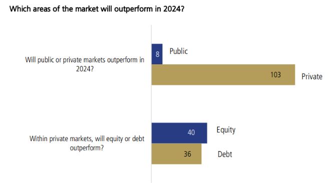 We polled our audience to gauge their current thinking about investment markets. Our audience overwhelmingly expects private markets to outperform public markets in 2024, with a relatively even split between private equity and private debt.