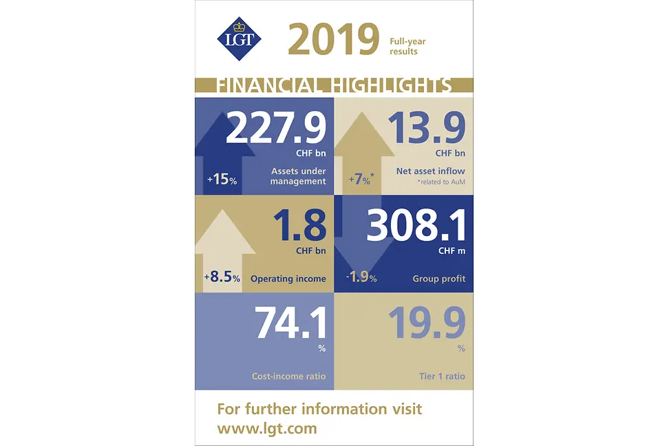 LGT achieved further strong revenue growth of 8% and a group profit of CHF 308.1 million in the 2019 financial year. Net asset inflows doubled year-on-year to CHF 13.9 billion, corresponding to an organic growth rate of 7%. Assets under management increased 15% to CHF 227.9 billion.