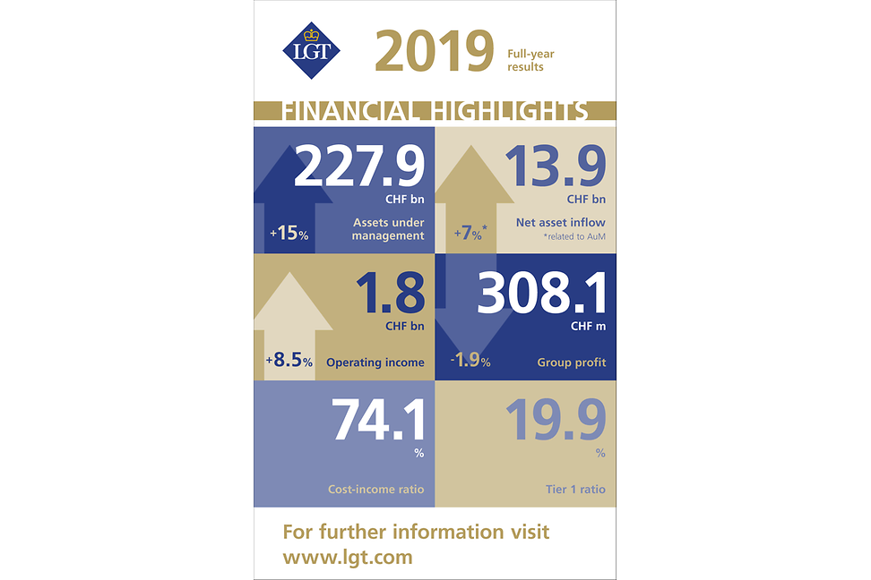 The cost-income ratio remained stable at 74.1% as at the end of 2019 compared with 74.0% as at the end of 2018. Overall, LGT achieved a group profit of CHF 308.1 million (-2%) in 2019, compared with CHF 314.1 million in the previous year.