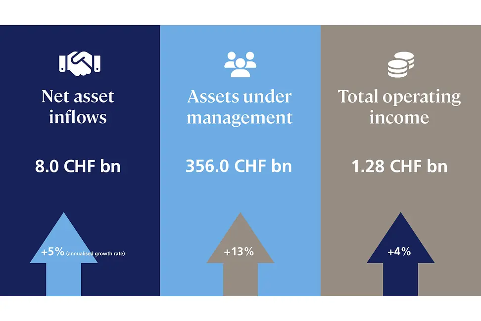 Organic net asset inflows totalled CHF 8.0 billion in the first half of 2024, which corresponds to an annualised growth rate of 5%. Both Private Banking and Asset Management contributed to this strong result. The reason for the year-on-year decrease in net new assets is a substantial one-off inflow from a major pension fund client of LGT Capital Partners in the first half of 2023, as previously communicated. Assets under management increased 13% to CHF 356.0 billion as at 30 June 2024, compared with CHF 316.0 billion as at year-end 2023. In addition to the net asset inflows, this reflects positive market performance and foreign currency effects.