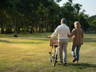 Caucasian elderly couples walking with a bicycle in the natural autumn sunlight garden