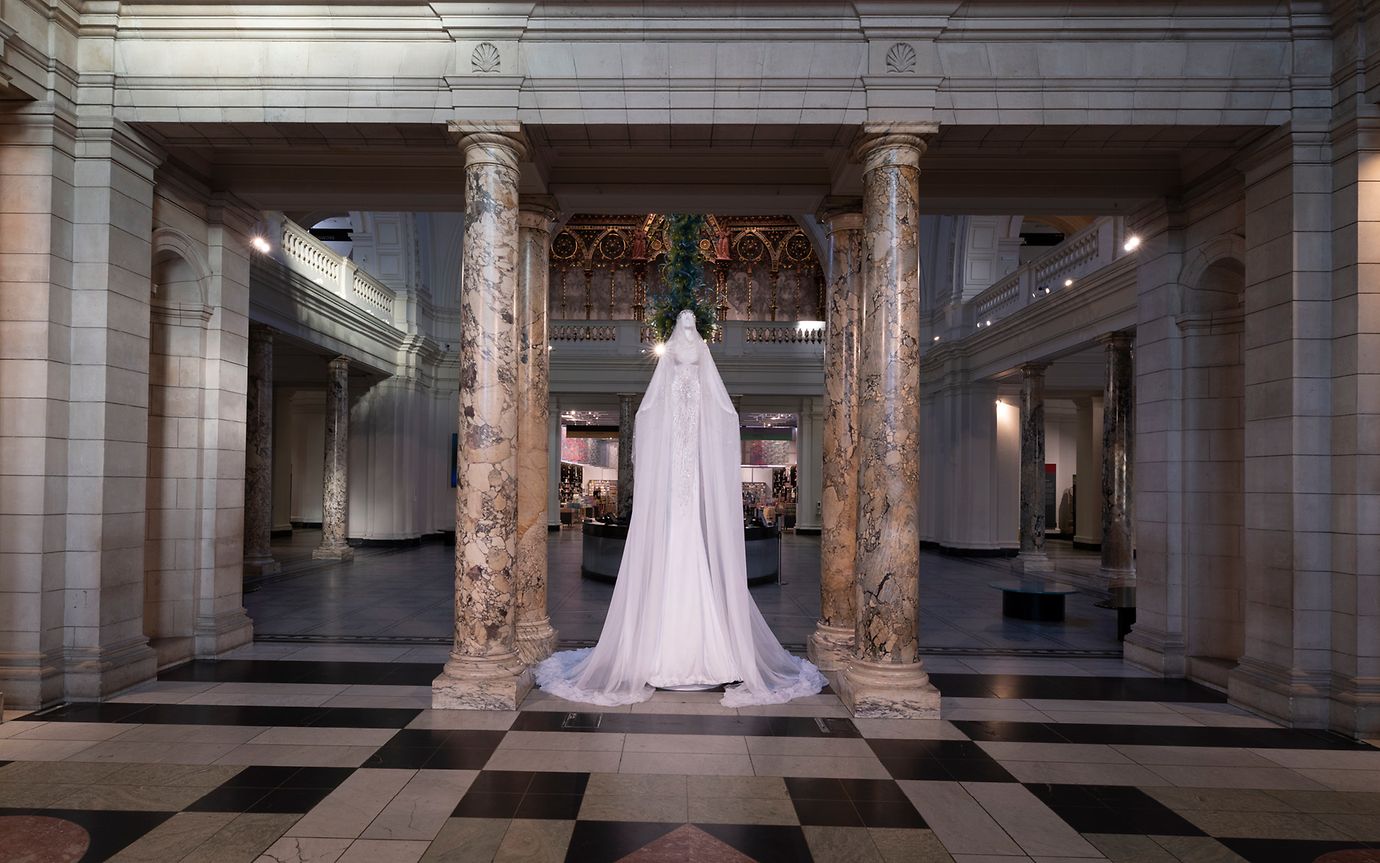 The three-metre ensemble combines Miss Sohee’s signature style of vibrant silhouettes and intricate embroidery with religious statuary found around the museum. Composed of a crepe-de-chine inner dress and a cascading snow-white silk chiffon cape embellished with star-inspired embroidery and Swarovski crystals, the gown is a striking and ethereal structure. Lit from above by a series of spotlights, the full splendour of the ensemble is revealed as crystals sparkle and shimmer.