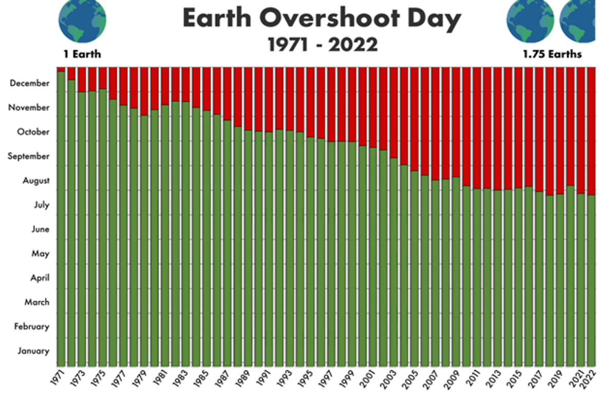 Similarly, the earth has an annual budget of natural resources which can be used by humans before the regeneration rate is overcome and these resources are depleted. The regeneration rate is the rate at which the earth can reproduce the resources used. In 2022, this day was calculated by the Global Footprint Network to be Thursday 28th July, just past the half-year mark and two days earlier than we hit the milestone last year. Worryingly, this trend of over exploiting our resources has accelerated hugely since it first began being tracked in 1971, where we would only hit our overshoot on the 25th of December.