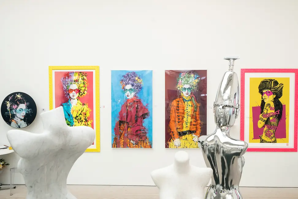 An artist known on a global scale for his depictions of Eurasian women and inspired by traditional and ceremonial dressing. A consistent West Contemporary collaborator and actively plying his trade worldwide (including being the only artist to be commissioned by the Frida Kahlo foundation for his 200ft mural of the iconic Mexican artist in Guadalajara), Fin DAC is a self-taught, non-conformist urban artist who has defined and perfected an atypical spray paint style he has dubbed ‘Urban Aesthetics’. Through his work, the artist explores themes related to female emancipation and empowerment, readjusting the male gaze and disrupting colonialist attitudes particularly surrounding the Eastern experience. One of his original works on display nodded to the illustrious settings of the art fair, with a subject wearing a Vivienne Westwood inspired jacket, paying homage to Kings Road and Westwood’s first ever shop there.