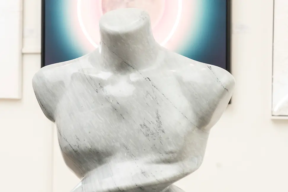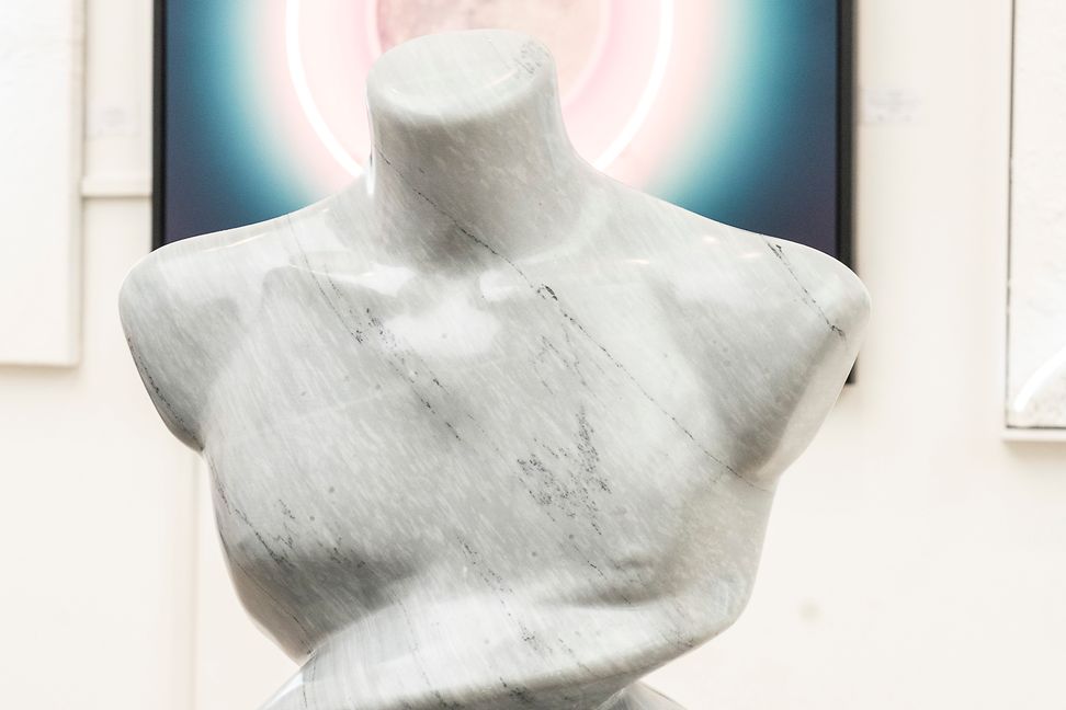 Beth Cullen-Kerridge is a highly known and appreciated sculptor, working mainly with bronze, stone and marble. The artist honed her craft working with and producing works for some of sculpture’s best known, including Edwardo Paolozzi, Elisabeth Frink and Alberto Giacometti, before becoming a studio assistant with Mike Bolus and then Sir Antony Caro. She has also impressively worked with Sir Norman Foster on the Millennium Bridge. This faultless grounding was clearly evidenced throughout the gallery space, with sculptures carefully curated throughout allowing guests the opportunity to walk amongst the creations. The collection on display was ‘Femella’, an exhibition with marble and bronze sculptures, celebrating how strong and great humans can be, despite the throws of the everyday.