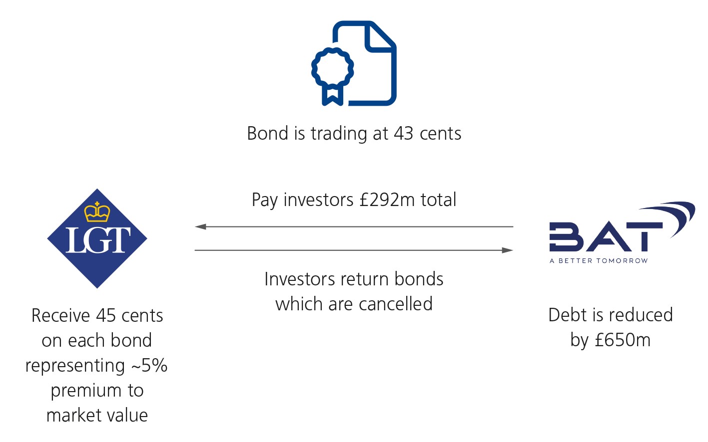 BAT offered to repurchase this bond from investors at a price of 45 cents, a 5% premium to the market price, an attractive opportunity for investors. To take the entire bond off the market, BAT would have paid investors around £292 million. However, given the full amount outstanding under this security was £650 million, the company would have been able to reduce borrowings on its balance sheet by the full £650 million. As a result, this tender is a win-win both for the company and the investors.