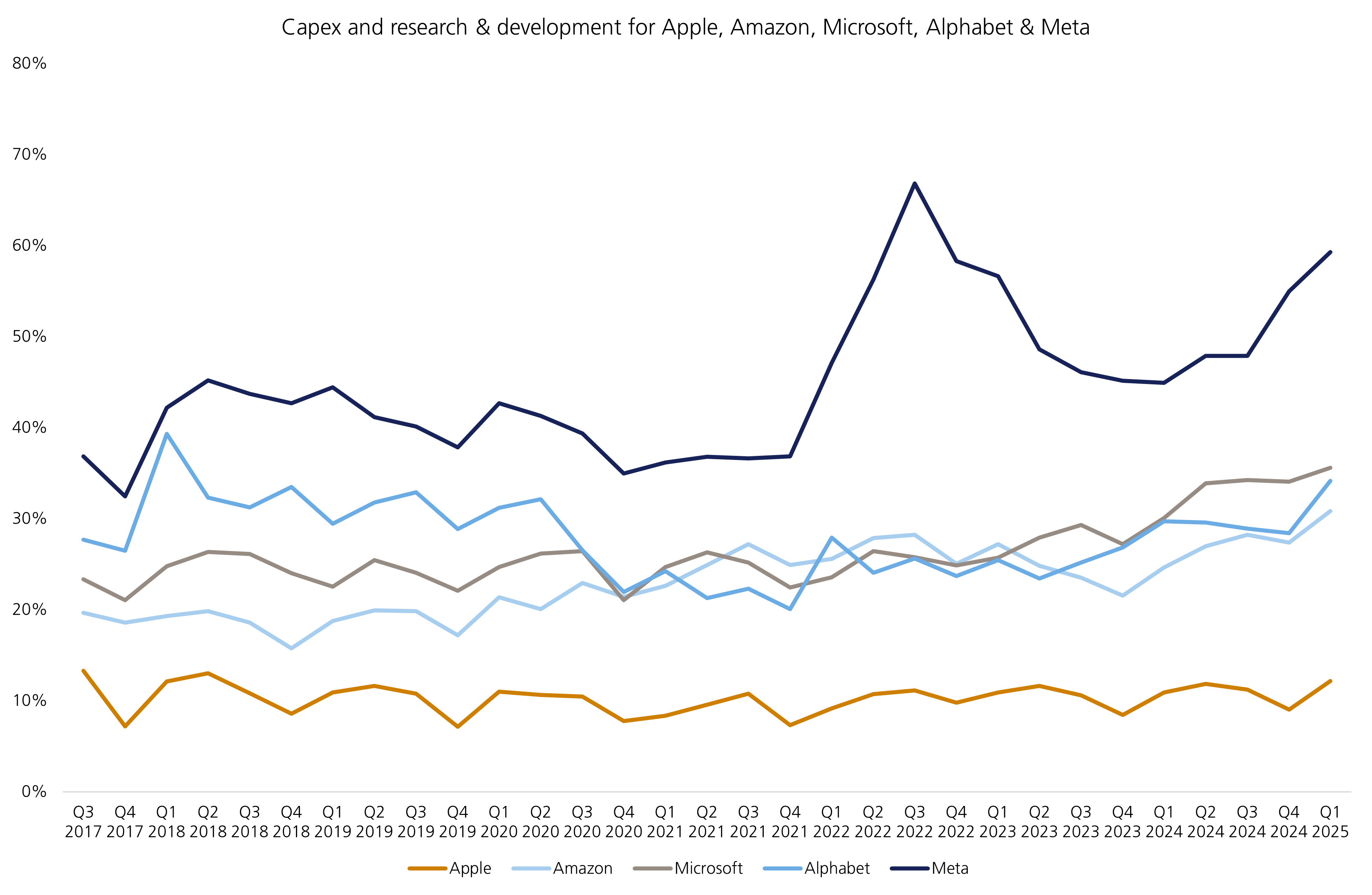 Amazon seems determined to win the ‘biggest spender on AI’ trophy with its $25 billion in Q1 capex, making Meta’s $17 billion look comparatively puny. Not unlike Microsoft, Amazon’s even bigger AWS cloud division has seen revenue growth reaccelerate from the 12-15% range in 2023 to 17-19% over the past year with management suggesting that modernising infrastructure and AI are helping drive this. Amazon’s $58 billion advertising business should also be a beneficiary of AI but decelerating growth suggests this has not happened yet.
