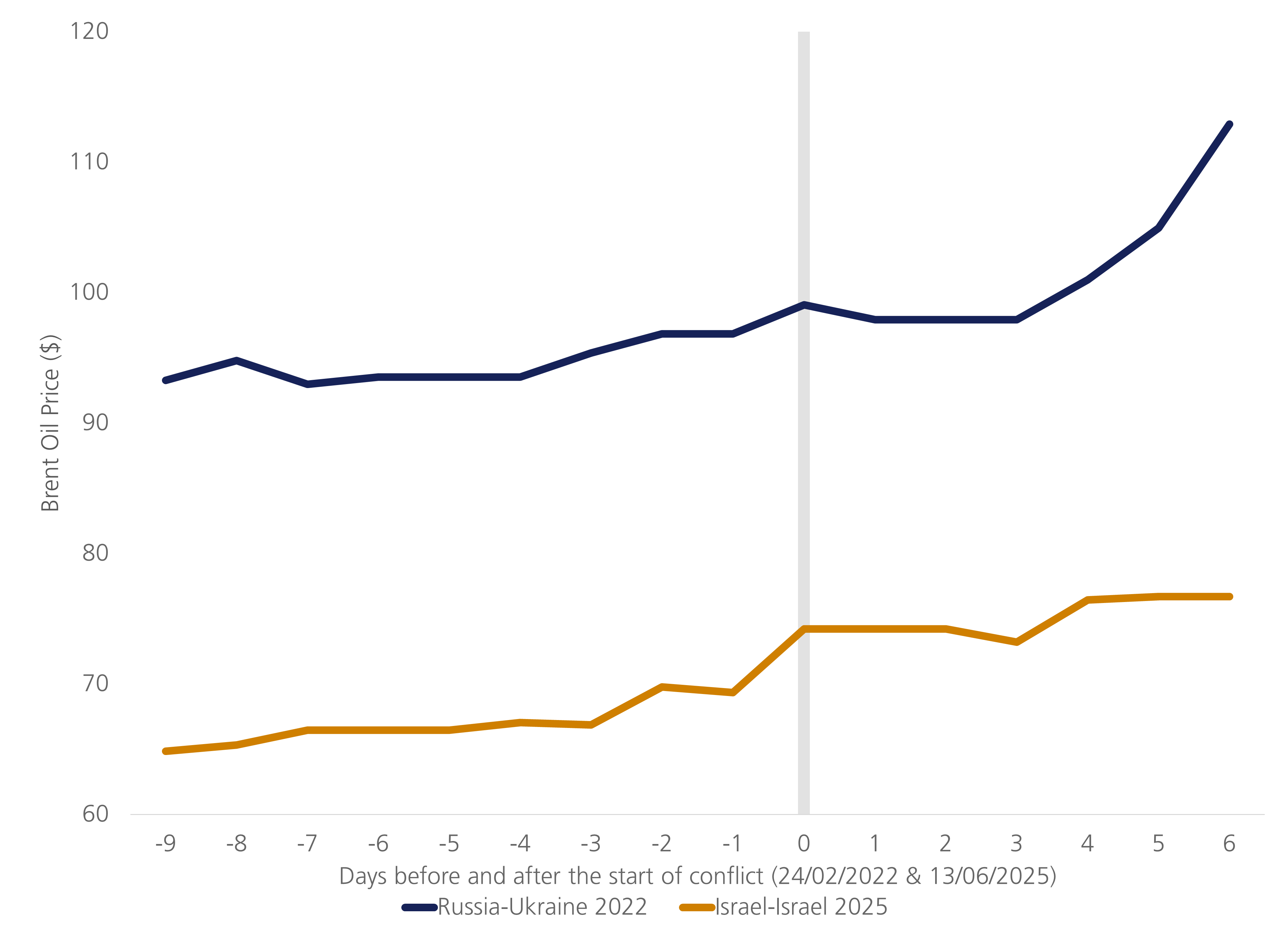 Conflict has escalated further in the Middle East following Israeli strikes on Iranian military and nuclear assets on Friday, 13 June. Oil prices lurched upwards on the news, with the benchmark front-month Brent oil future climbing 7% from $69 per barrel to $74 per barrel on the day. Since then, prices continue to drift higher as there are no signs of peace talks. For investors, the conflict resurfaces unpleasant recollections of the energy shock caused by Russia’s invasion of Ukraine in 2022 or for those with longer memories, the oil embargos of the 1970s. However, it is important to remember that history may rhyme but it doesn’t often repeat, and there are key differences between past conflicts and today’s that we believe are worth exploring in this week’s Brief.