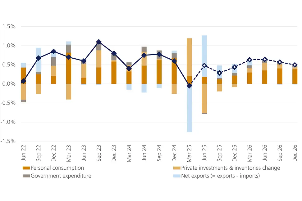 In this turbulent economic landscape, clarity is hard to come by. Yet by focusing on the vital drivers of growth and inflation, we can chart a path forward. As Trump’s trade policy shifts introduce large swings in trade and inventories, focusing on private consumption and fixed investments—which account for 68% and 18% of GDP respectively —provides a clearer picture of the current state of the US economy. While private fixed investment grew strongly in Q1, driven by large spending on information processing equipment, consumption growth slowed. We expect both GDP components to decelerate below trend, though not enough to tip the US economy into recession. Overall, we forecast that increased tariffs, reduced immigration and prolonged uncertainty will reduce US GDP growth to around 1.2% and increase inflation towards 3.1% in 2025 and anticipate the Fed will cut rates two more times towards year-end.
