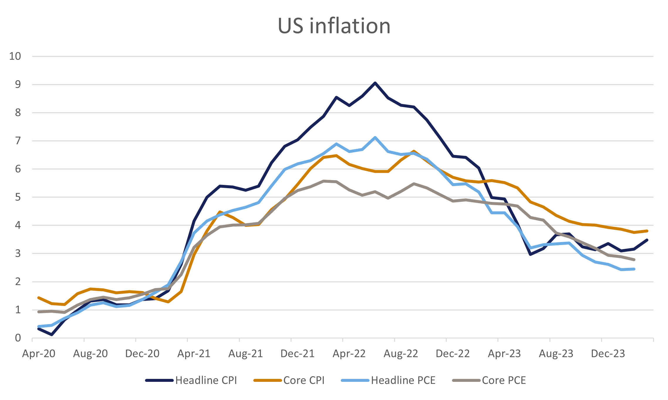 Consequently, investors have moved to price in the first 0.25% rate cut in September from June or July, with another one expected in December. This means investors are pricing a total reduction of 0.5% for 2024. However, given the upside surprises in prices and robust economic activity, some are questioning whether we are now embarking on a new inflationary period, thus requiring no cuts at all. While these concerns are palpable, it is worth bearing in mind that headline inflation as expressed by CPI has remained between 3 to 4% since June last year and core price pressures have been trending lower. Meanwhile, the Fed’s preferred measure, Personal Consumer Expenditure remains below 3% annualised on a headline and core basis.4 The inflation shocks over the last few years have been driven by supply shocks during periods of strong demand and evidence continues to point to a significant recovery in supply chains.