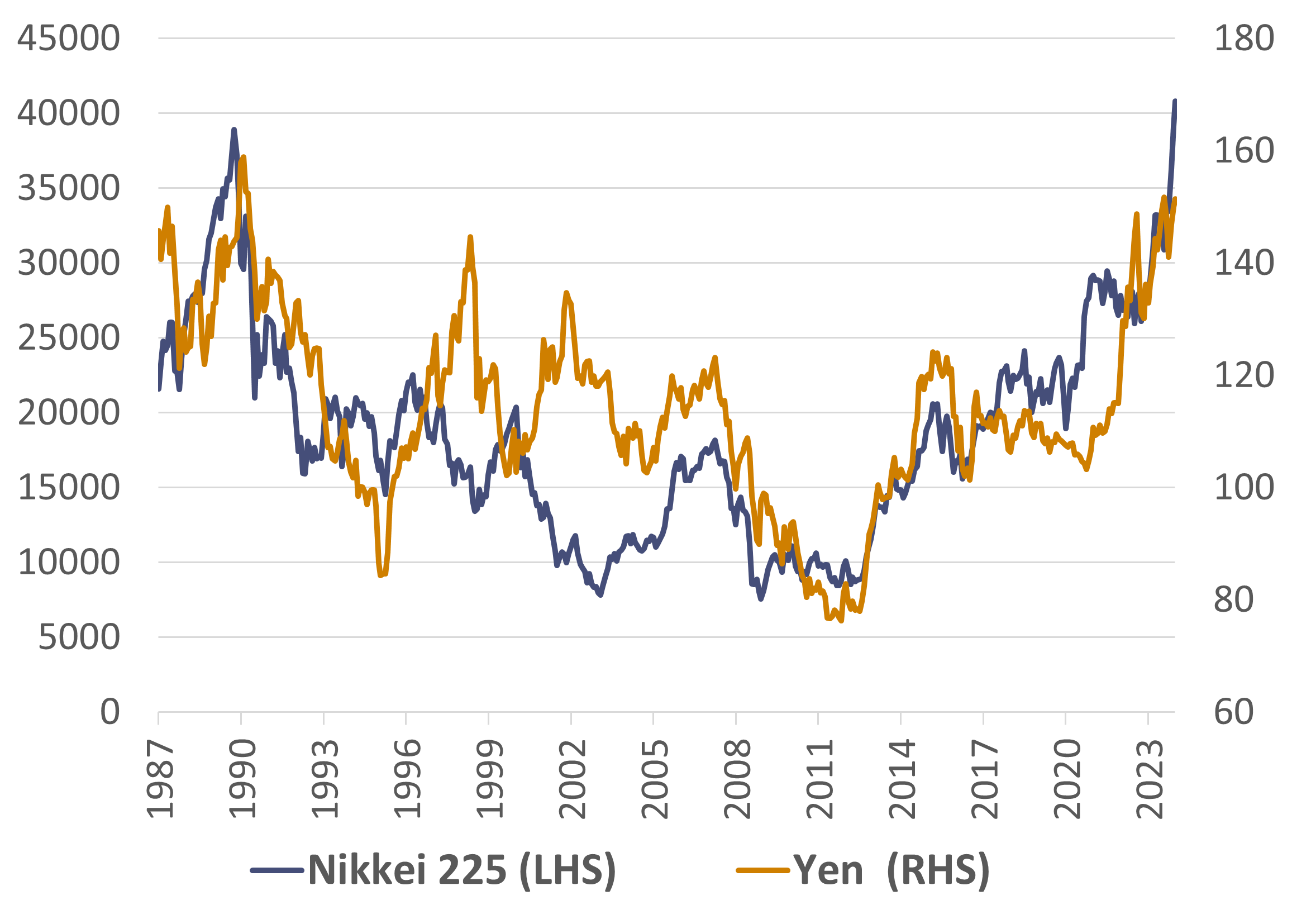 The Nikkei 225 surpassed a previous all-time high this week while the yen approaches its weakest level since 1990.