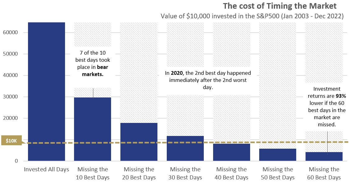 In conclusion, the economic landscape of 2023 has given rise to opportunities for a reimagined 60/40 portfolio, combining income from bonds with the potential for long-term equity gains. While cash accounts may seem attractive with their high-interest rates, they may not protect against inflation. Market timing remains a challenging practice, and investors are encouraged to stay invested in a well-diversified portfolio to capture long-term growth and navigate market fluctuations.