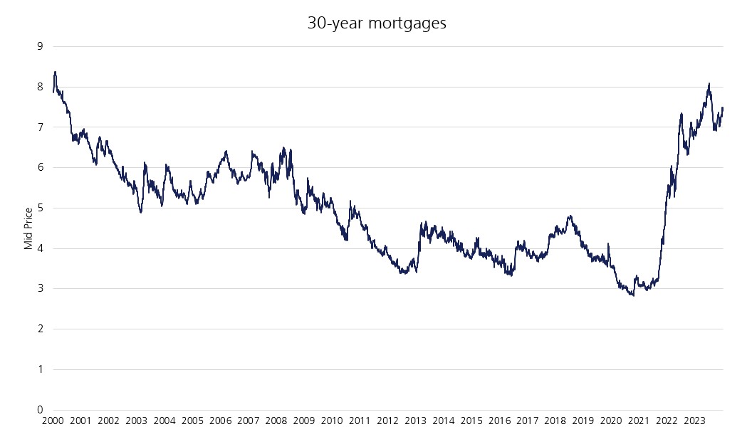 But as inflation challenged economies, the Federal Reserve (Fed) began hiking interest rates, pushing mortgage rates from 3% at the start of 2022 to over 7% towards the end of last year, where they remain today. At current levels, mortgage rates are the highest in over two decades.1 This has made many homes unaffordable, ultimately weighing on housing activity. Buyers remain reluctant to purchase new homes at these high rates, which has effectively frozen the housing market and made renting more attractive. Consumers weighing the trade-off between renting versus buying a house is typical of a hiking cycle.