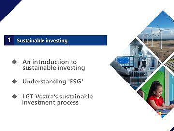Learning objectives include: an introduction to Sustainable Investing, understanding ‘ESG’ and our sustainable investment process.
