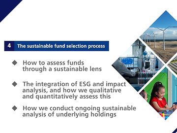 Learning objectives include: how to assess funds through a sustainable lens, the integration of ESG and impact analysis, and how we qualitatively and quantitatively assess this, and how we conduct ongoing sustainable analysis of underlying holdings.