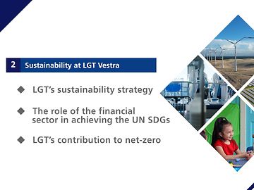 Learning objectives include: LGT’s sustainability strategy, the role of the financial sector in achieving the UN SDGs and LGT’s contribution to net-zero.