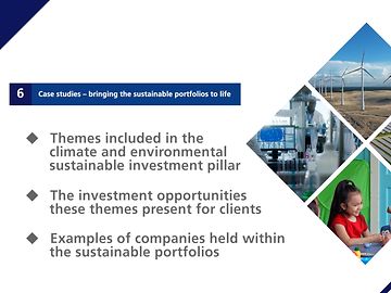 Learning objectives include: themes included in the climate and environmental sustainable investment pillar, the investment opportunities these themes present and examples of companies held within the sustainable portfolios.
